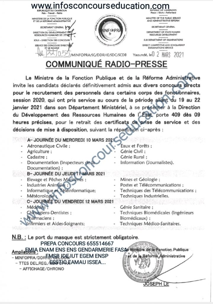 Le Ministre de la Fonction Publique et de la Réforme Administrative invite les candidats déclarés définitivement admis aux divers concours directs pour le recrutement des personnels dans certains corps des fonctionnaires, session 2020, qui ont pris service au cours de la période allant du 19 au 22 janvier 2021 dans son Département Ministériel, à se présenter à la Direction du Développement des Ressources Humaines de l’État, porte 409 dès 09 heures précises, pour le retrait des certificats de prise de service et des décisions de mise à disposition, suivant la répartition ci-après: