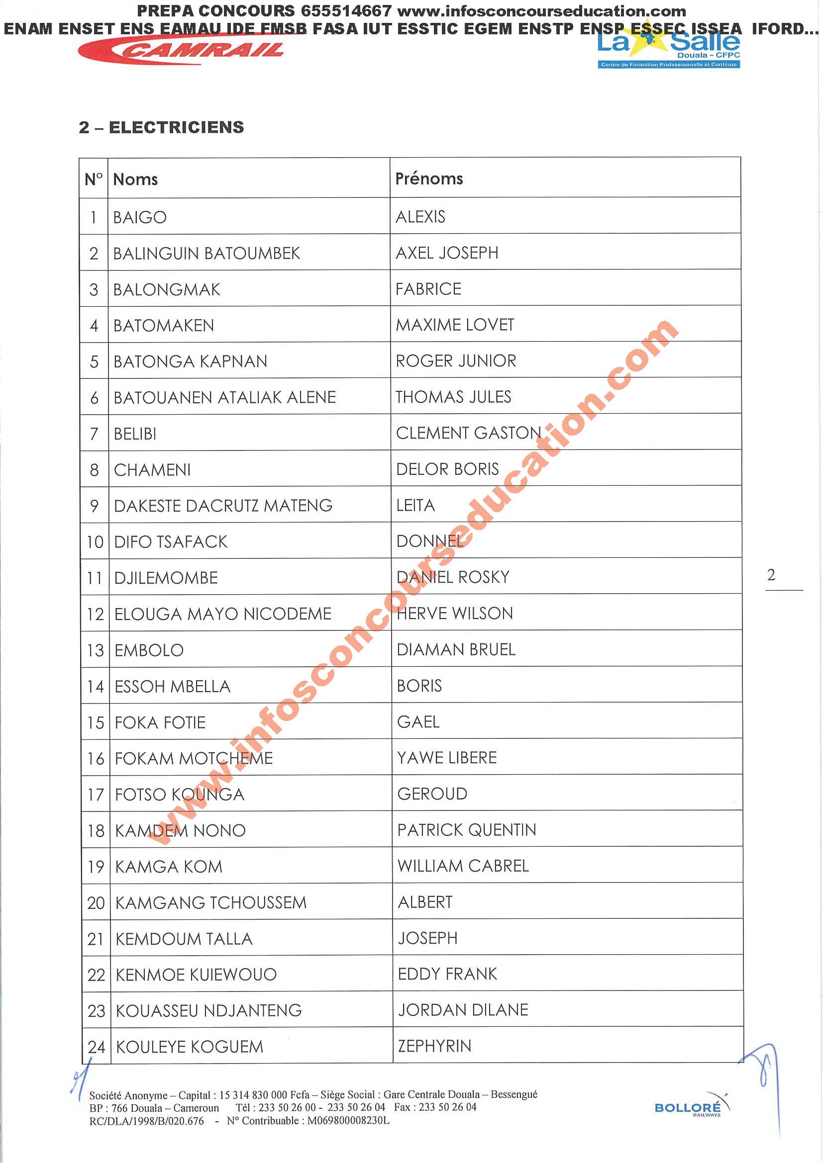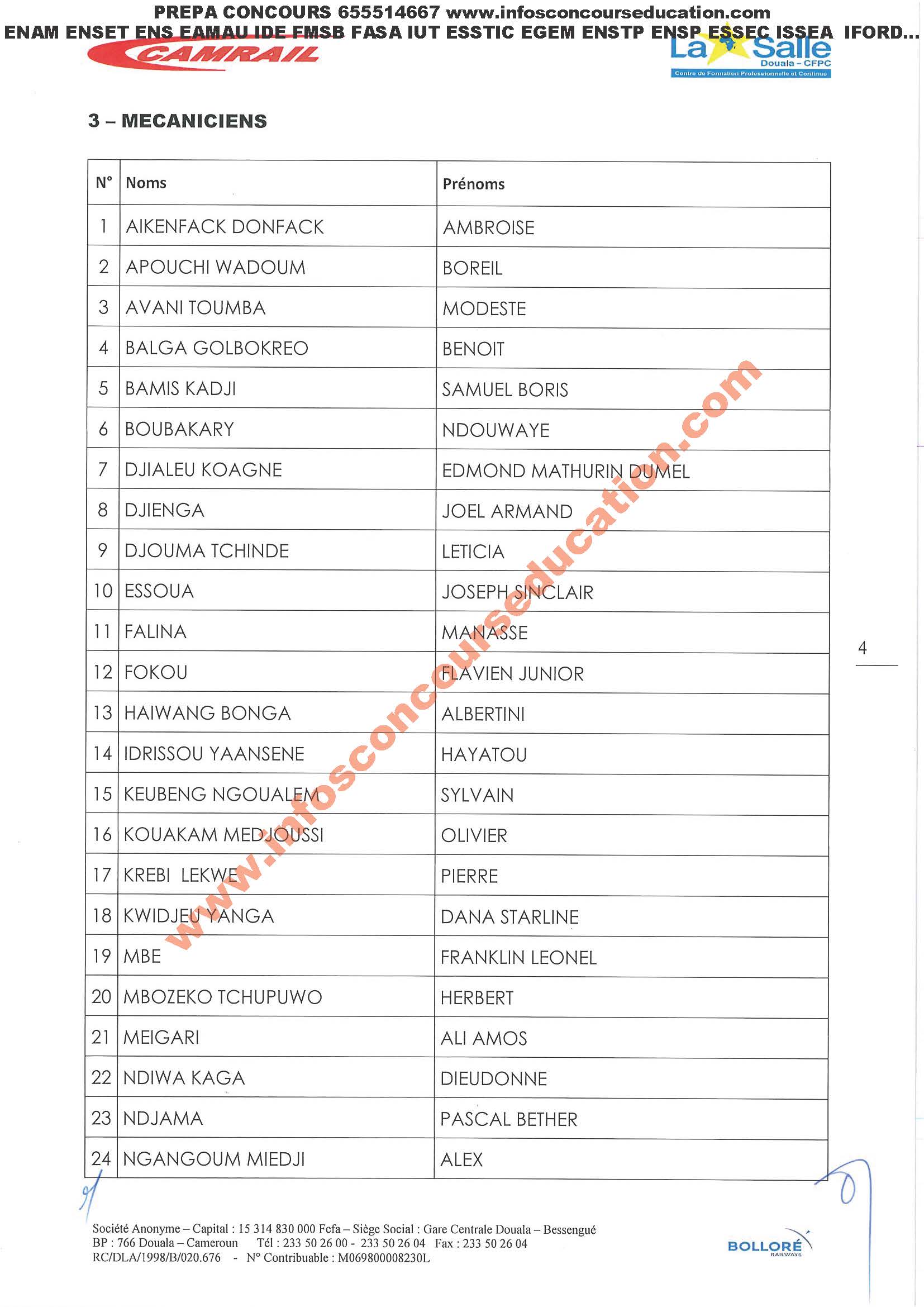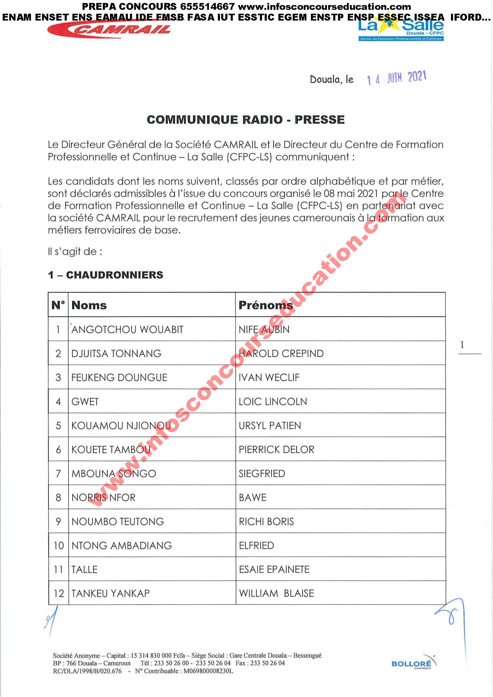Les candidats dont les noms suivent, classés par ordre alphabétique et par mérite, sont déclarés admissibles à l’issue du concours organisé le 08 mai 2021 par le Centre de Formation Professionnelle et Continue – La Salle (CFPC-LS) en partenariat avec la société CAMRAIL pour le recrutement des jeunes camerounais à la formation aux métiers ferroviaires de base.