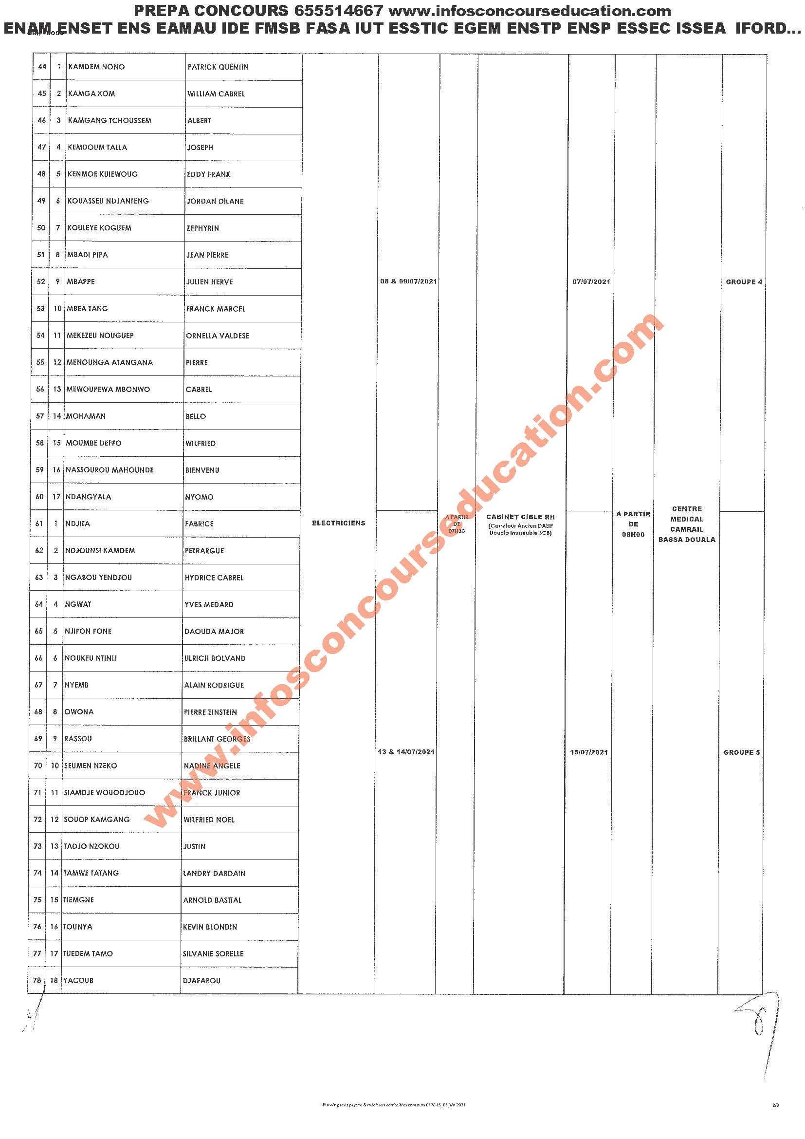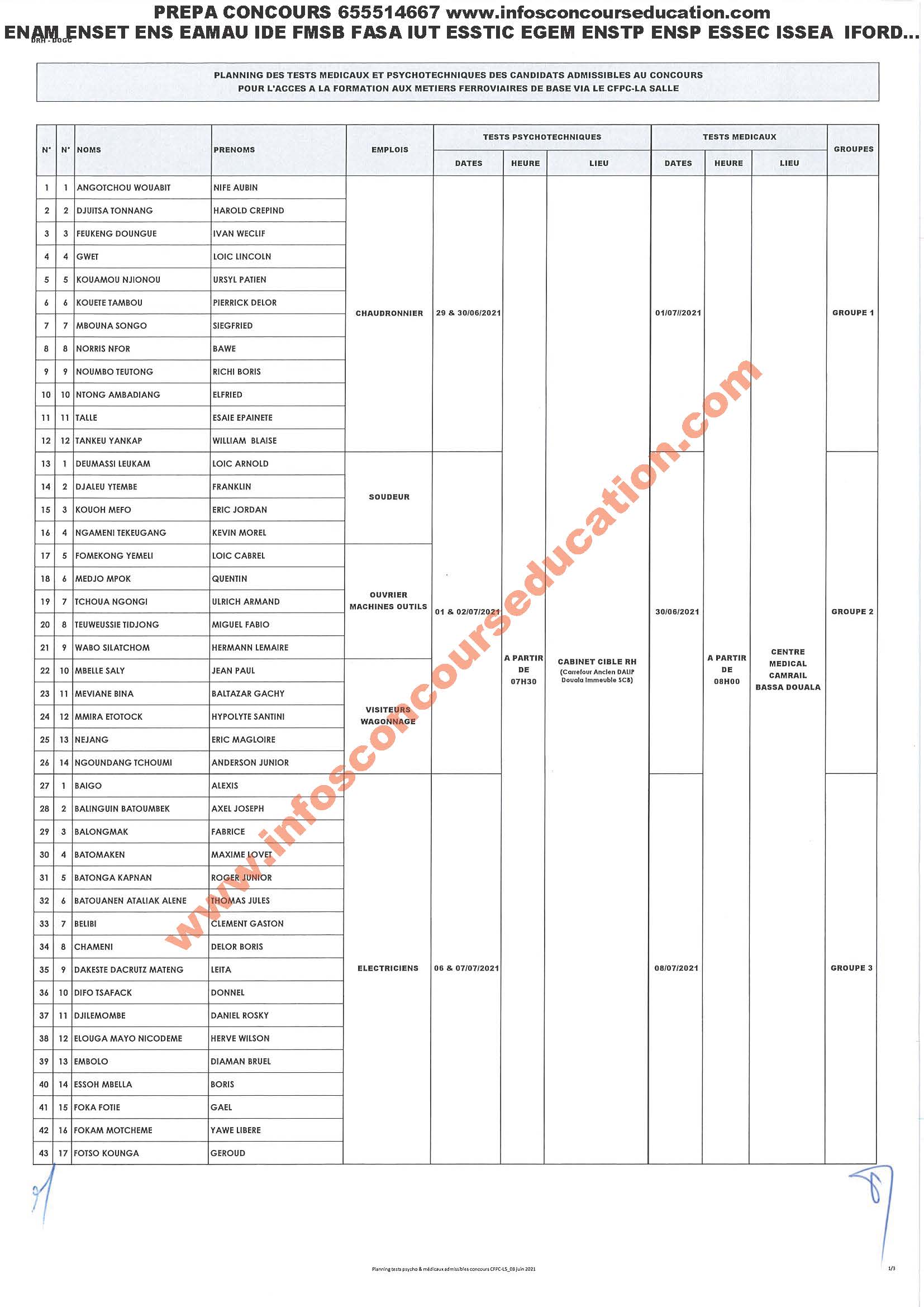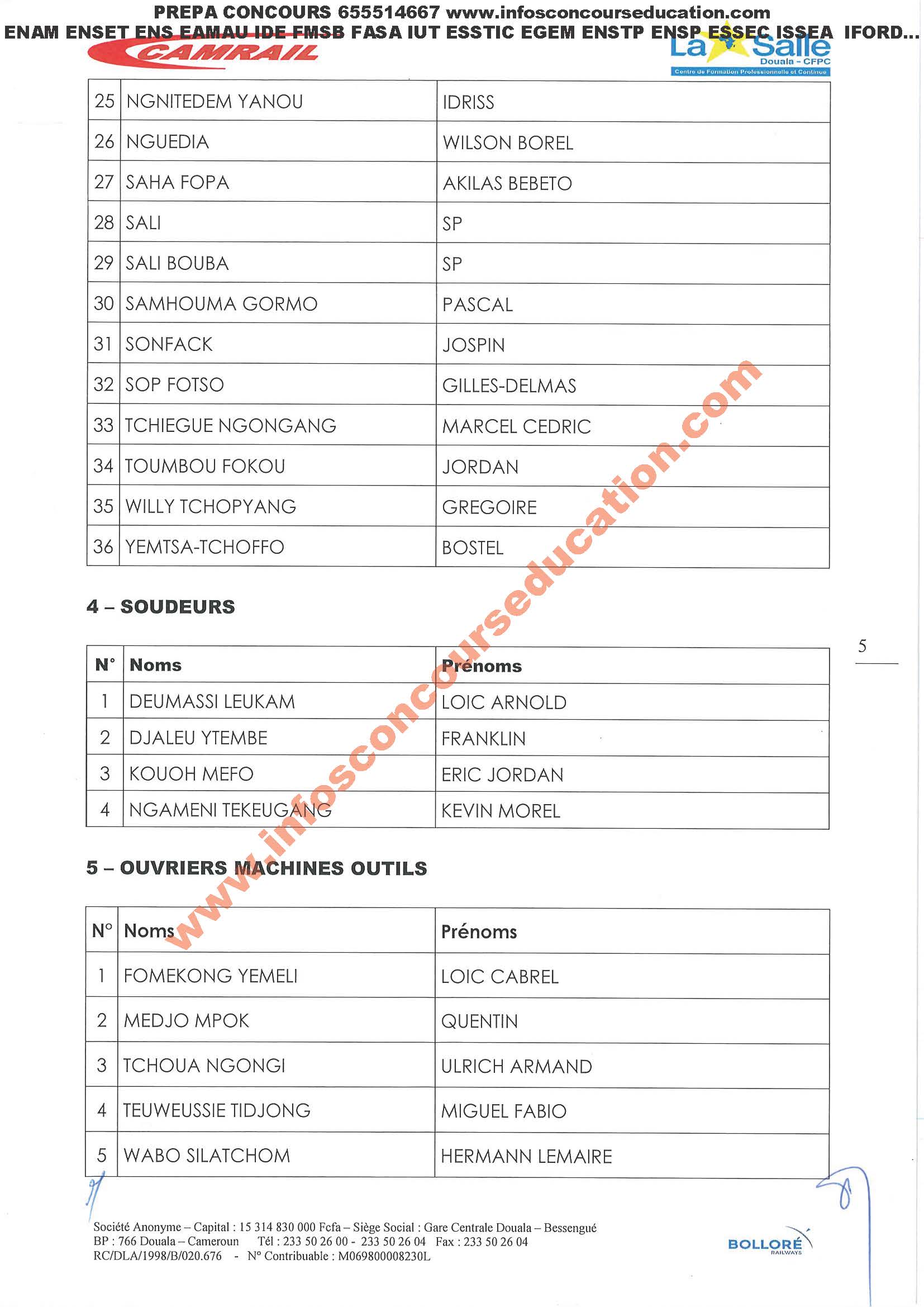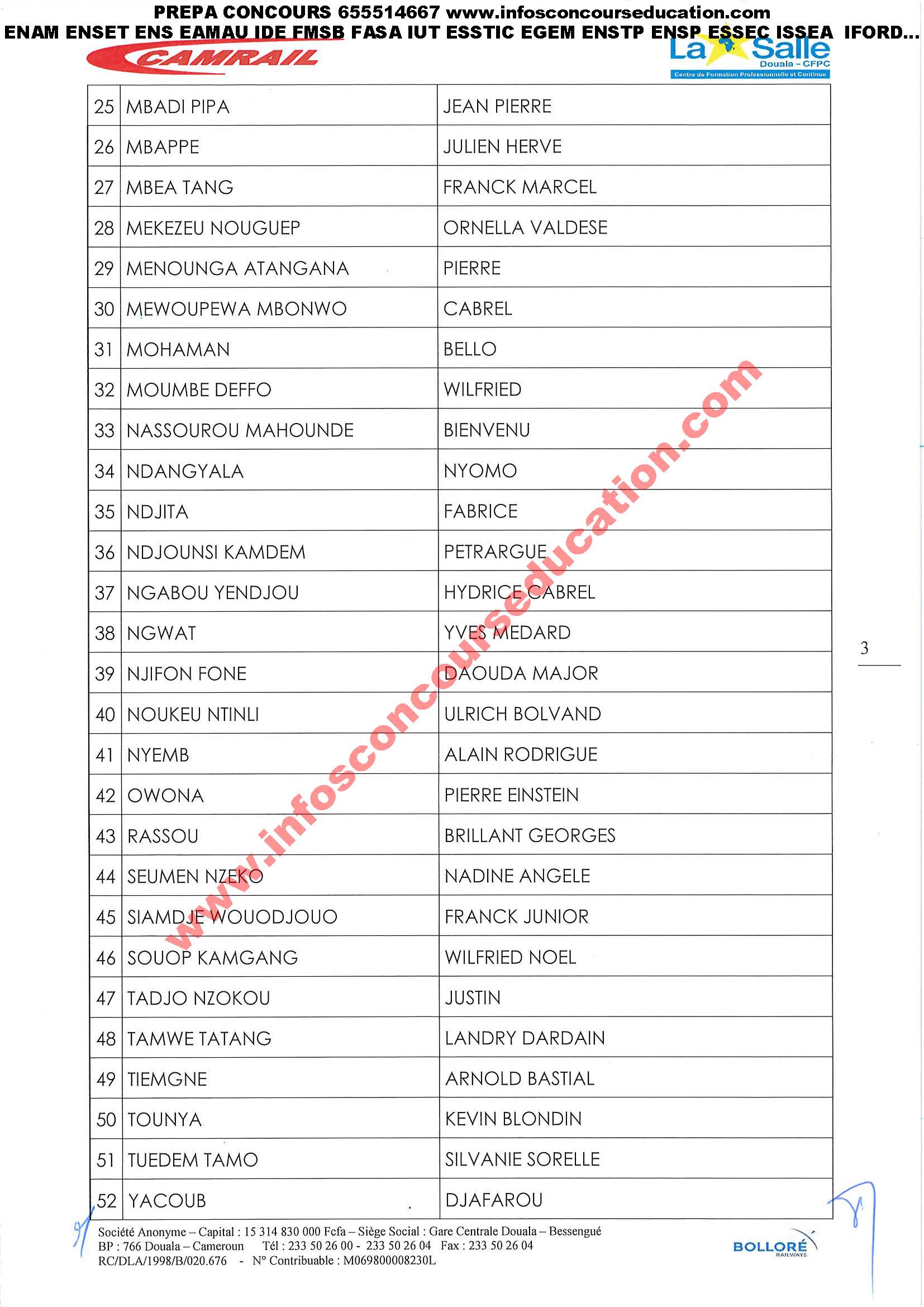 Les candidats dont les noms suivent, classés par ordre alphabétique et par mérite, sont déclarés admissibles à l’issue du concours organisé le 08 mai 2021 par le Centre de Formation Professionnelle et Continue – La Salle (CFPC-LS) en partenariat avec la société CAMRAIL pour le recrutement des jeunes camerounais à la formation aux métiers ferroviaires de base.