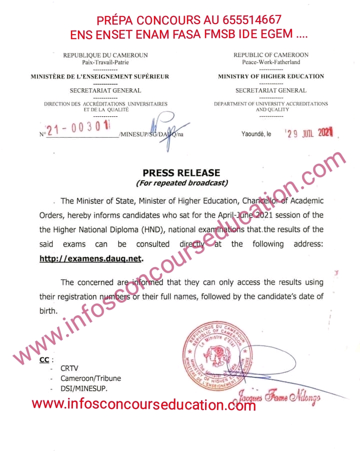 Les candidats, dont les noms figurent ci-dessous par ordre de mérite, ont été déclarés admis à la session 2021 de l’Examen du Diplôme National Supérieur (HND), dans les domaines d’études, Spécialités et Options indiqués ci-après.