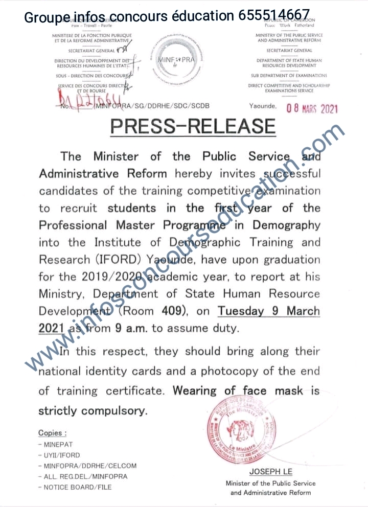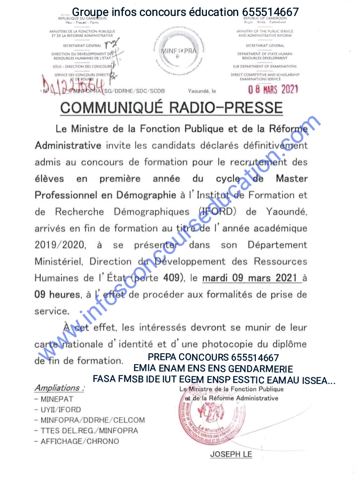 Communiqué à l’attention des candidats admis au concours de l’Institut de foFormati et de recherche démographique (iford) arrivés en fin de formation pour l’année académique 2019-2020