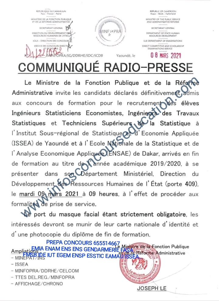 Communiqué à l’attention des candidats admis au concours d’issea cycle ise et its arrivés en fin de formation pour l’année académique 2019-2020