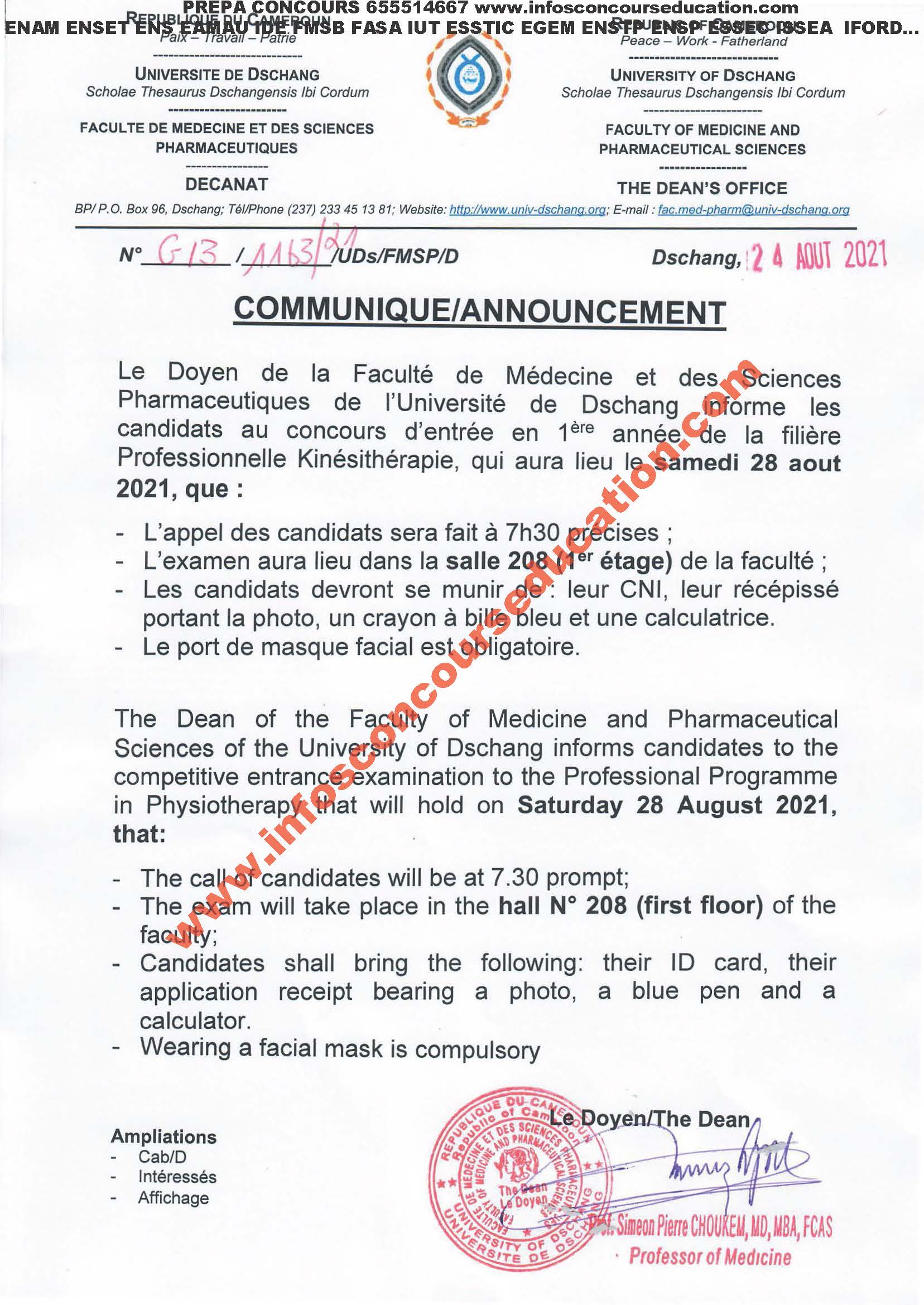 The Dean of the Faculty of Medicine and Pharmaceutical Sciences of the University of Dschang informs candidates to the competitive entrance examination to the Professional Programme in Physiotherapy that will hold on Saturday 28 August 2021, that: