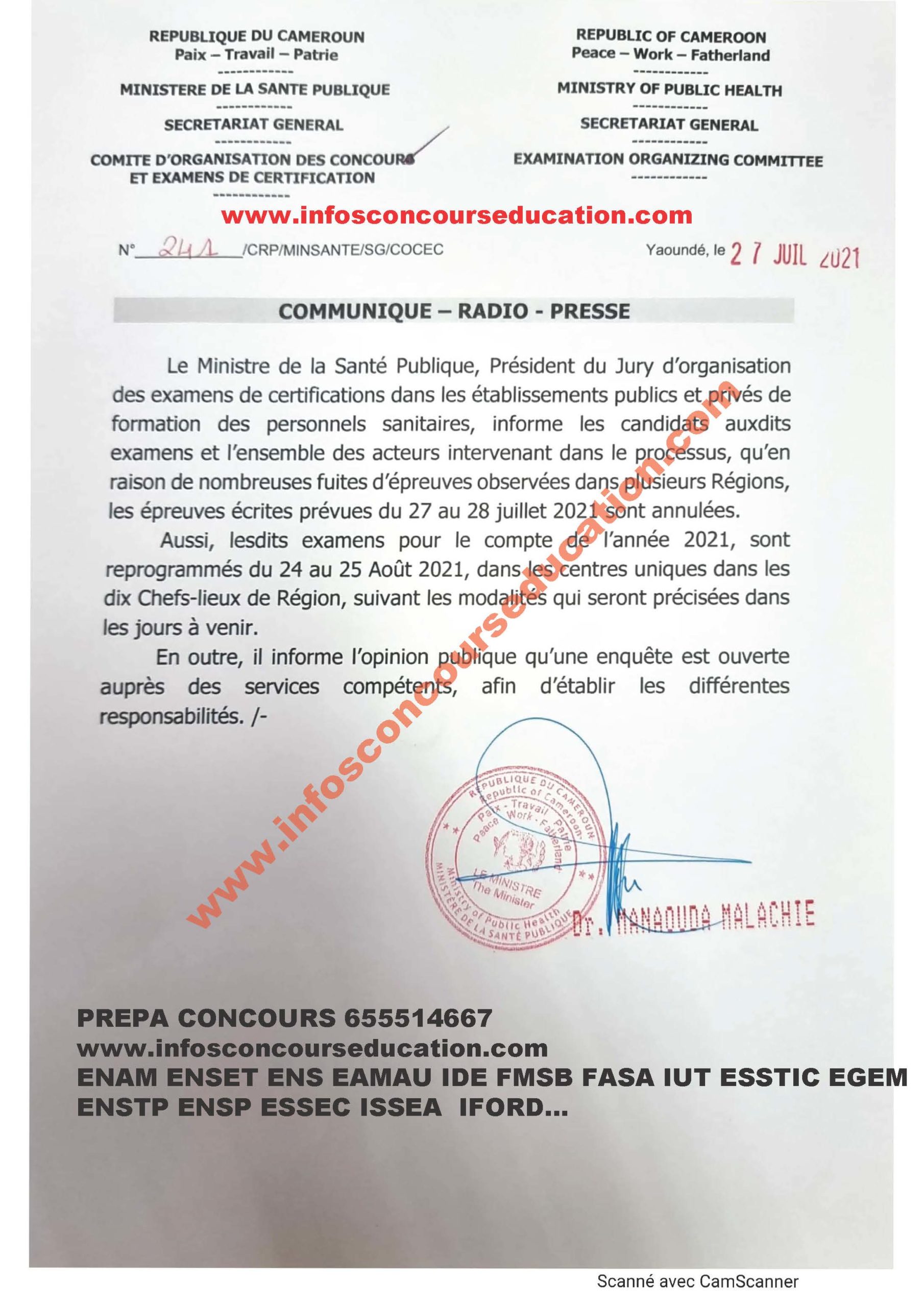 Le Ministre de la Santé Publique, Président du Jury d'organisation des examens de certifications dans les établissements publics et privés de formation des personnels sanitaires, informe les candidats auxdits examens et l'ensemble des acteurs intervenant dans le processus, qu'en raison de nombreuses fuites d'épreuves observées dans plusieurs Régions, les épreuves écrites prévues du 27 au 28 juillet 2021 sont annulées