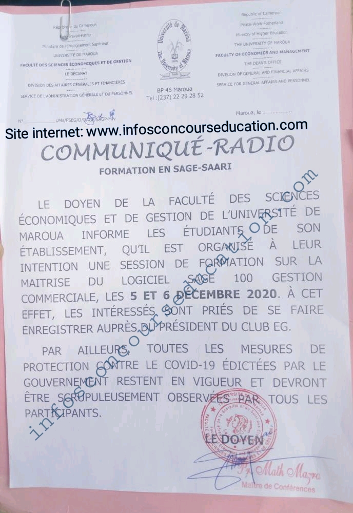 HomeCommuniqués officielsCommuniqué université maroua Communiqués officiels Communiqué université maroua 19 November 2020 0 302 Publié par Le Bénévole Share FacebookTwitterPinterestWhatsApp Le doyen de la faculté des sciences économiques et de gestion de l’Université de Maroua informe [wpforms id=”1772″] LEAVE A REPLY Cancel reply Comment: Please enter your comment! Name:* Please enter your name here Email:* You have entered an incorrect email address! Please enter your email address here Website: Save my name, email, and website in this browser for the next time I comment. Δ Share FacebookTwitterPinterestWhatsApp Previous articleCommuniqué aux lauréats de la 11ème promotion ens marouaNext articleConcours isstsm 2020 communiqué Le Bénévole ARTICLES SIMILAIRES Communiqués officiels Résultats examens de certification du Minsanté 2025 26 September 2025 Communiqués officiels DV Lottery 2026/2027: Guide pour Immigrer aux USA 25 September 2025 Communiqués officiels Inscription à la loterie américaine 2027 de A à Z 24 September 2025 POPULAIRES EN CE MOMENT Résultats examens de certification du Minsanté 2025 26 September 2025 DV Lottery 2026/2027: Guide pour Immigrer aux USA 25 September 2025 Inscription à la loterie américaine 2027 de A à Z 24 September 2025 Calendrier Examens et Concours MINEDUB 2026 24 September 2025 Sélection 5000 Etudiants-Entrepreneurs Minesup/Minjec 2025 16 September 2025 Que faire après les résultats du concours Douanes 2025? 8 September 2025 Lieu de Composition Concours ENSTP (MEng) 2025 3 September 2025 Recrutement et formation de 300 jeunes au MINEFOP 2 September 2025 Load more