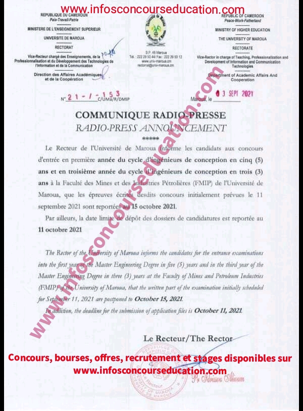 le recteur de de l’université de maroua informe les candidats aux concours d’entrée en première année du cycle ingénieurs de conception en 5 ans et en troisième année du cycle ingénieurs de conception en 3 ans à la faculté des mines et des industries pétrolières (FMIP) de l’université de maroua , que les épreuves écrites desdits concours initialement prévues le 11 septembre sont reportées au 15 octobre 2021