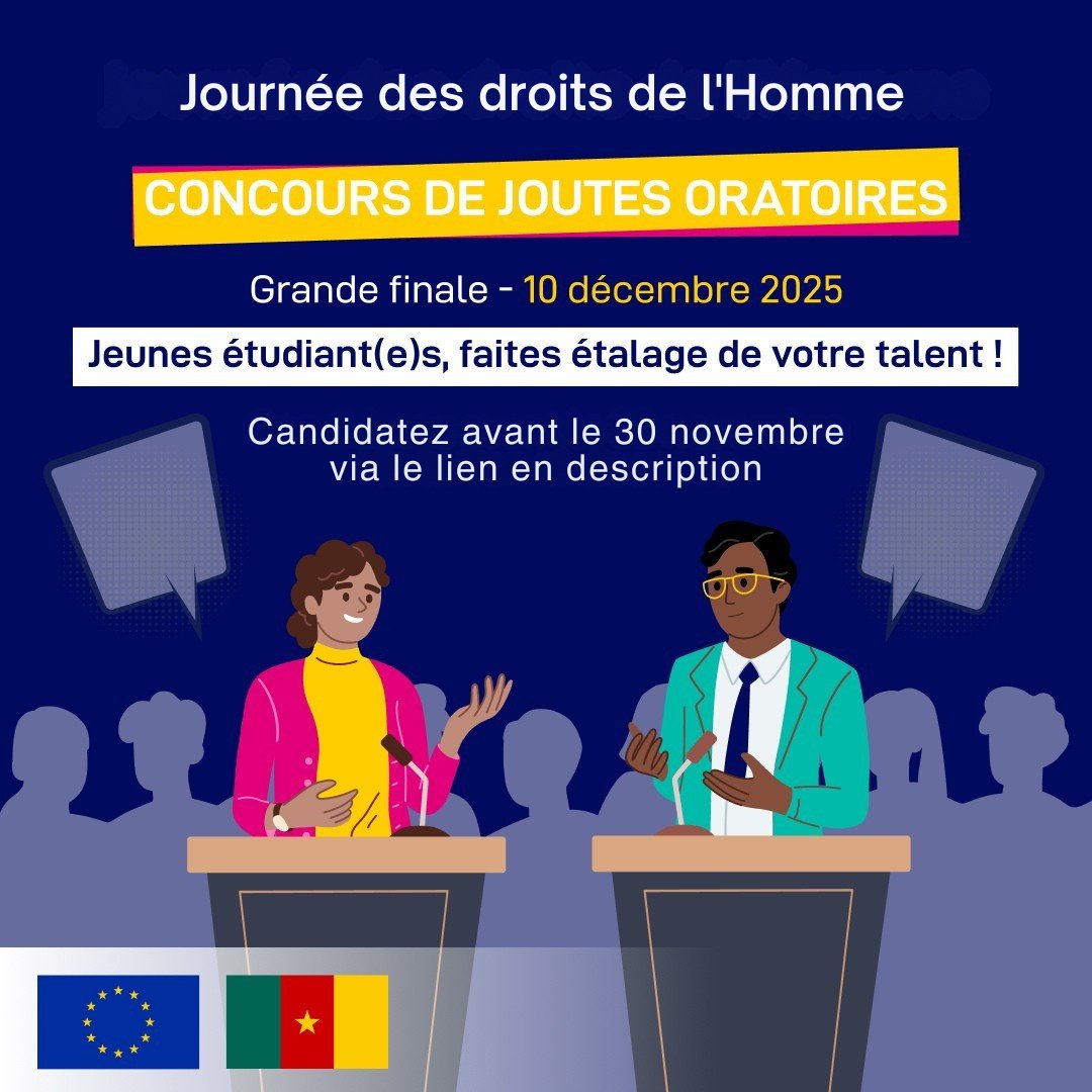 À l’occasion de la Journée internationale des droits humains, célébrée le 10 décembre, la Team Europe (Délégation de l’Union européenne (UE) et États membres représentés à Yaoundé) lance l’édition 2025 du Concours de joutes oratoires. Les jeunes âgés de trente ans au plus disposent d’une dizaine de jours pour démontrer leurs talents en plaidoyer en faveur d’un meilleur respect des droits humains.