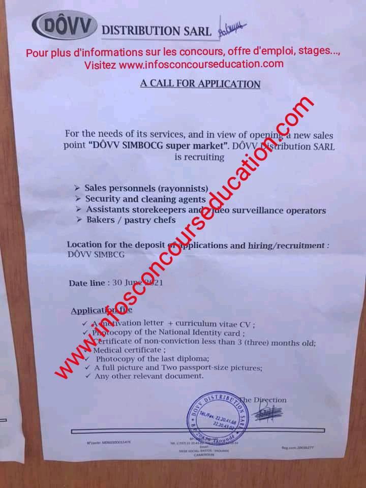 Pour des besoins de ses services, et en prélude à l’ouverture du nouveau supermarché DOVV SIMBOCK, la société Dovv Distribution recrute