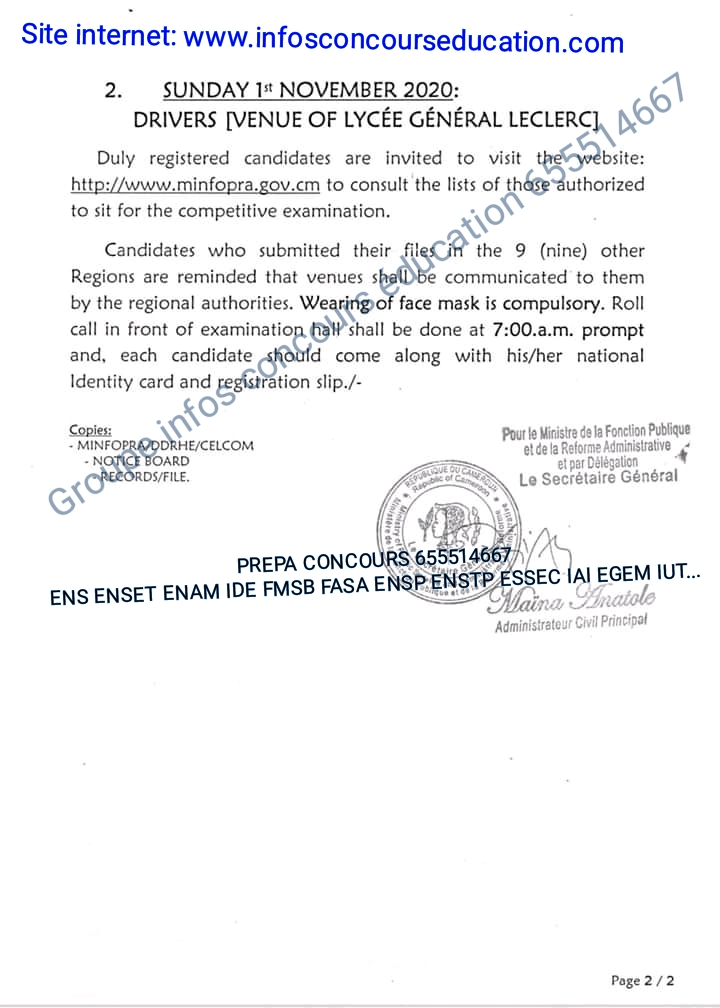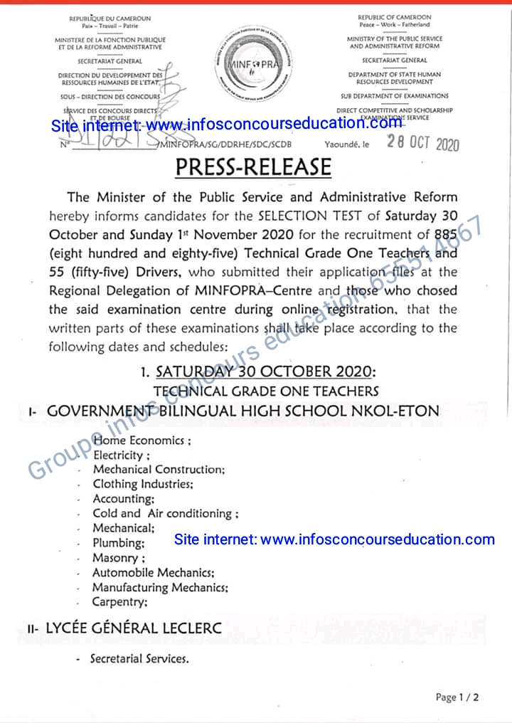 Le Ministre de la Fonction Publique et de la Réforme Administrative informe les candidats aux TESTS DE SÉLECTION des samedi 30 octobre et dimanche 1er novembre 2020 pour le recrutement de huit cent quatre-vingt-cinq (885) Instituteurs de l’Enseignement Technique et Professionnel et de cinquante-cinq (55), chauffeurs que les épreuves se dérouleront dans les centres ci-dessous