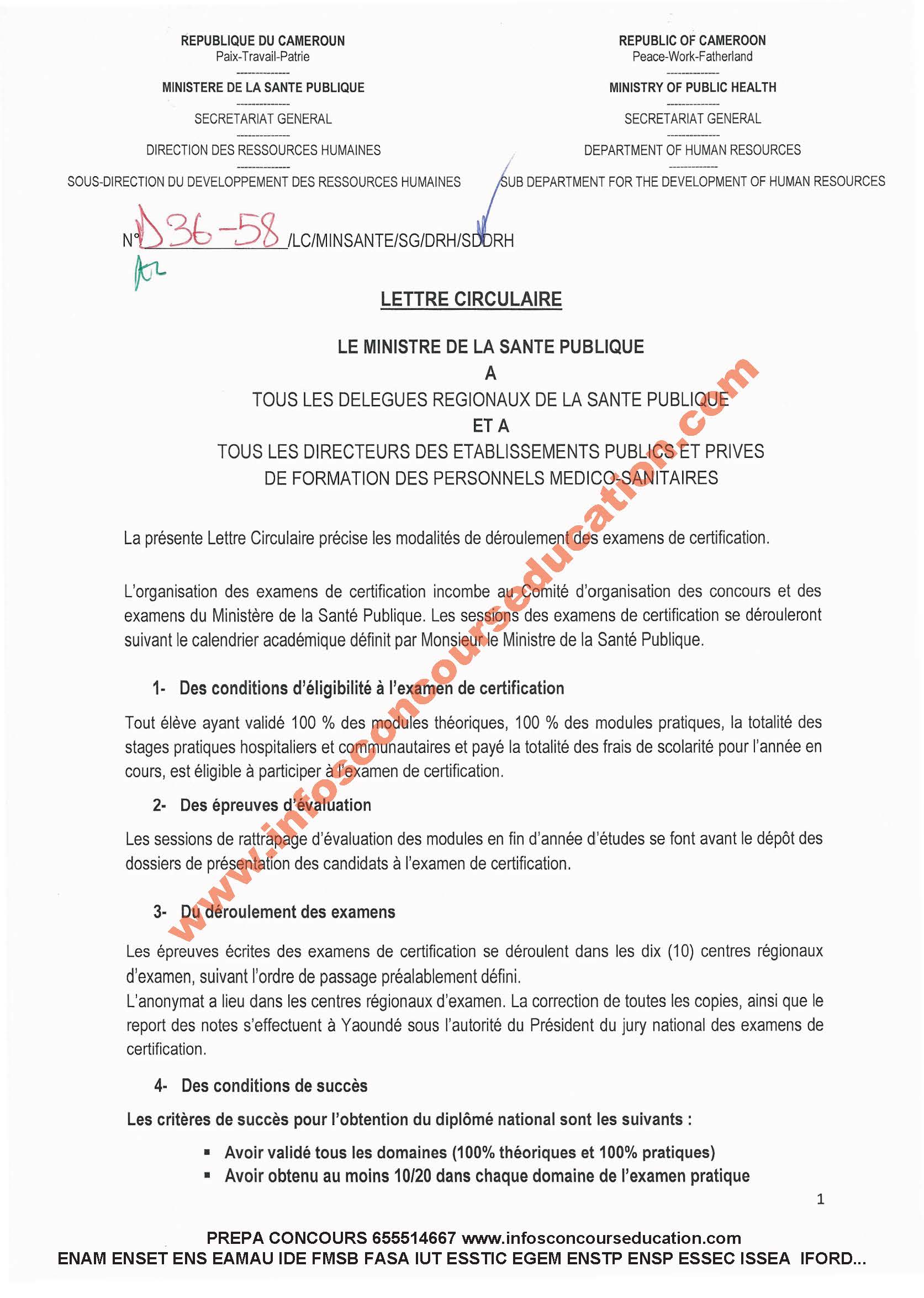 La présente Lettre Circulaire précise les modalités de déroulement des examens de certification. L’organisation des examens de certification incombe au Comité d’organisation des concours et des examens du Ministère de la Santé Publique. Les sessions des examens de certification se dérouleront suivant le calendrier académique définit par Monsieur le Ministre de la Santé Publique.