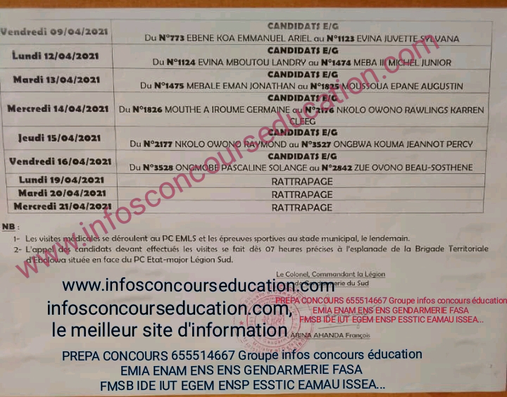 planning de déroulement des visites médicales et épreuves sportives pour les candidats au recrutement des PNO au profit de la gendarmerie nationale enrégistrés dans la légion du sud