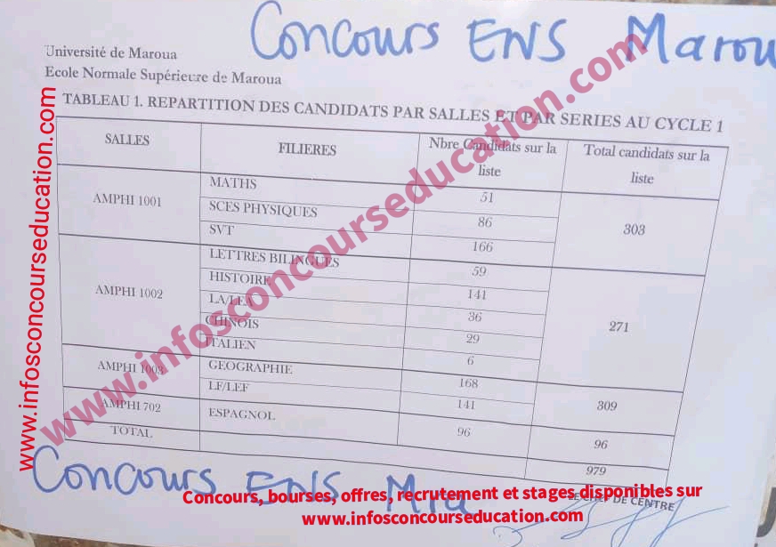 Répartition des candidats par salles et par série au concours l’ENS de Maroua 2021 centre de yaoundé