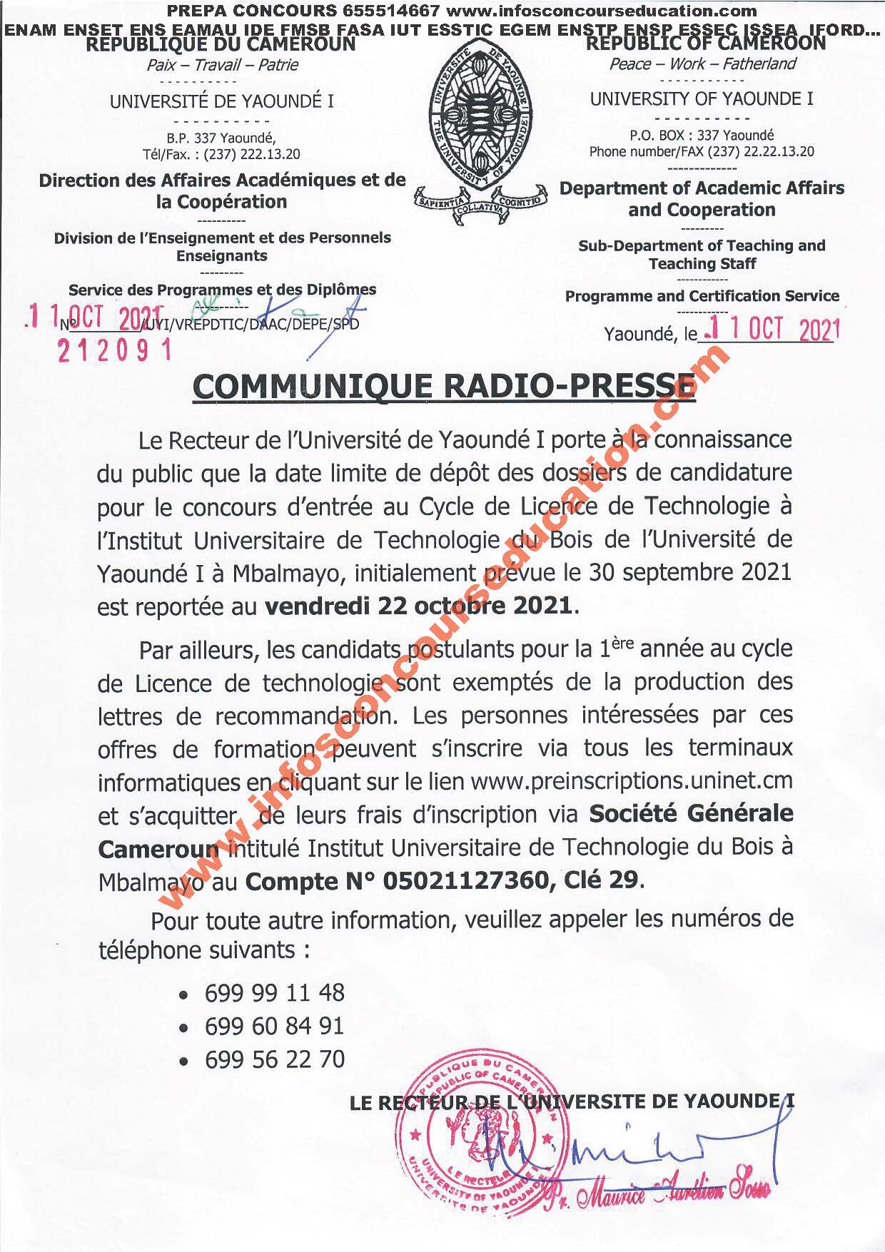 Le Recteur de l’Université de Yaoundé I porte à la connaissance du public que la date limite de dépôt des dossiers de candidature pour le concours d’entrée au Cycle de Licence de Technologie à l’Institut Universitaire de Technologie du Bois de l’Université de Yaoundé I à Mbalmayo, initialement prévue le 30 septembre 2021 est reportée au vendredi 22 octobre 2021
