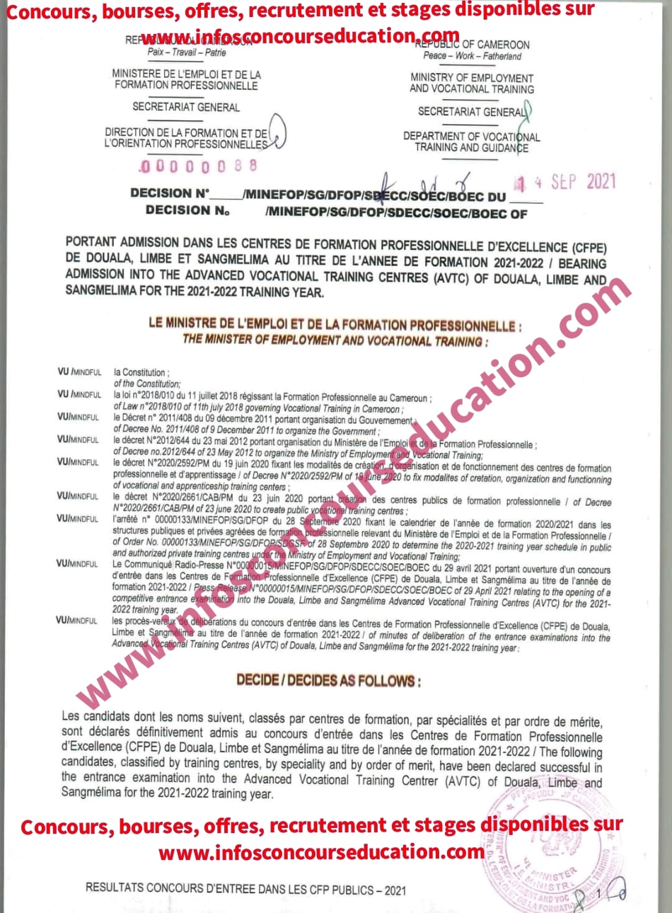 Portant admission dans les centres de formation professionnelle d’excellence (CFPE) de Douala, limbé et sangmelima au titre de l’année de formation 2021-2022/