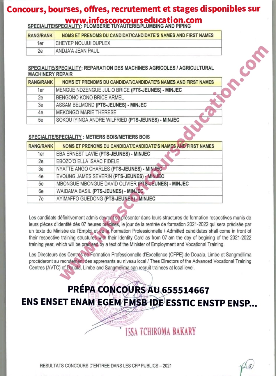 Résultats concours d’entrée dans les CFP publics MINEFOP 2021