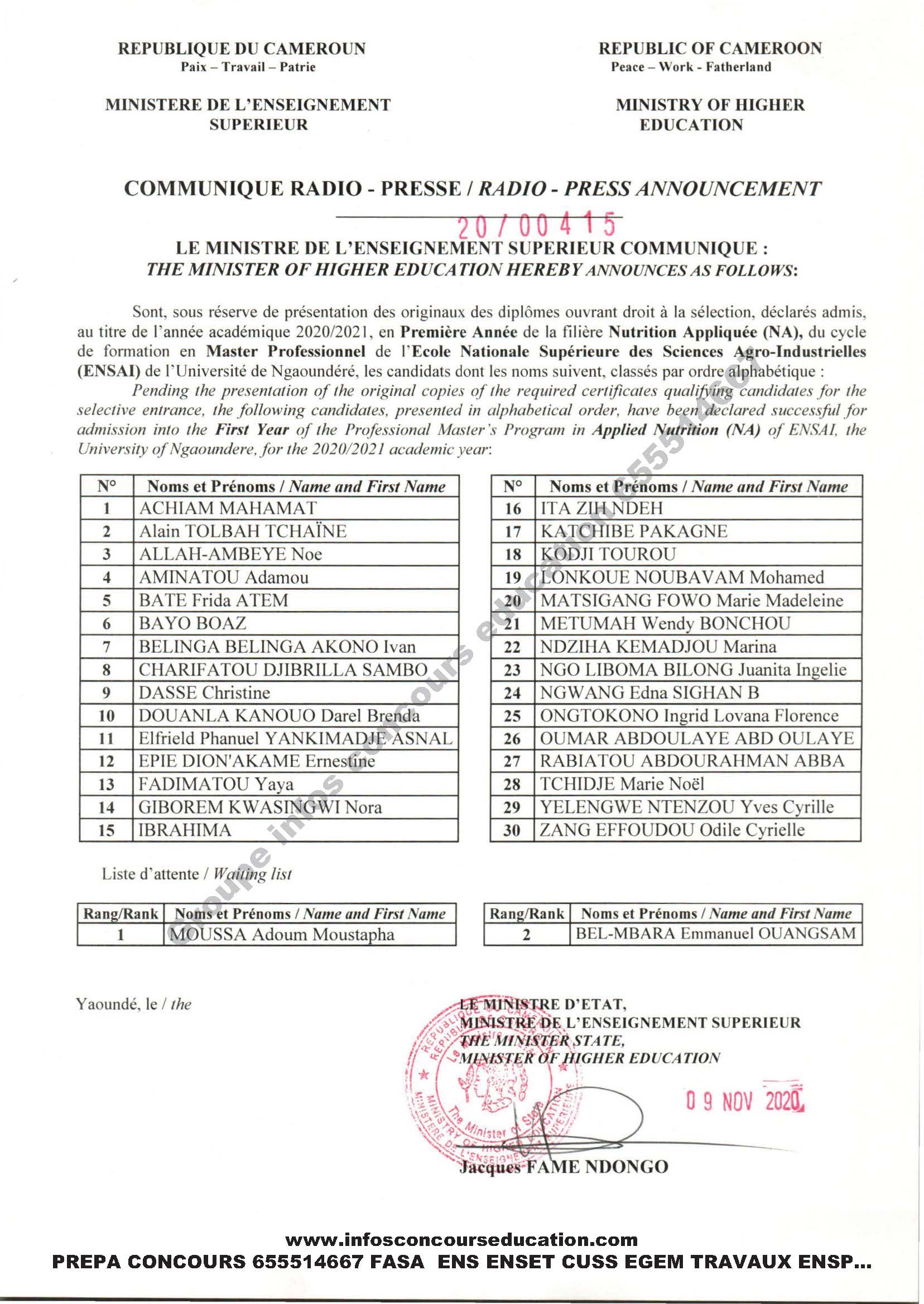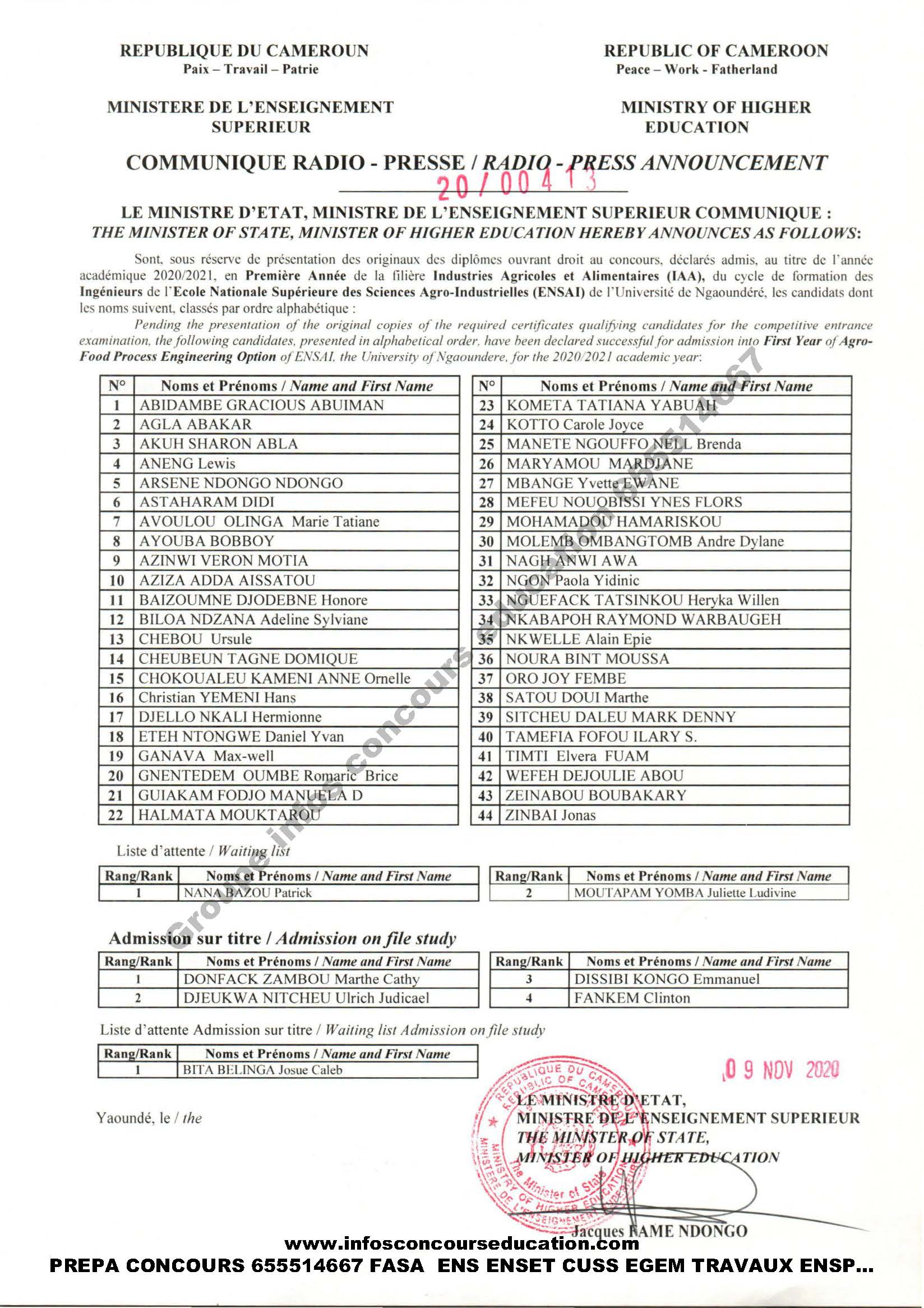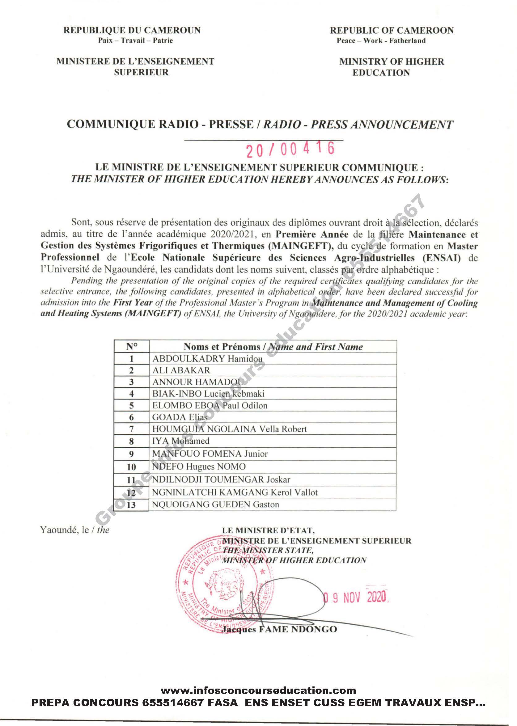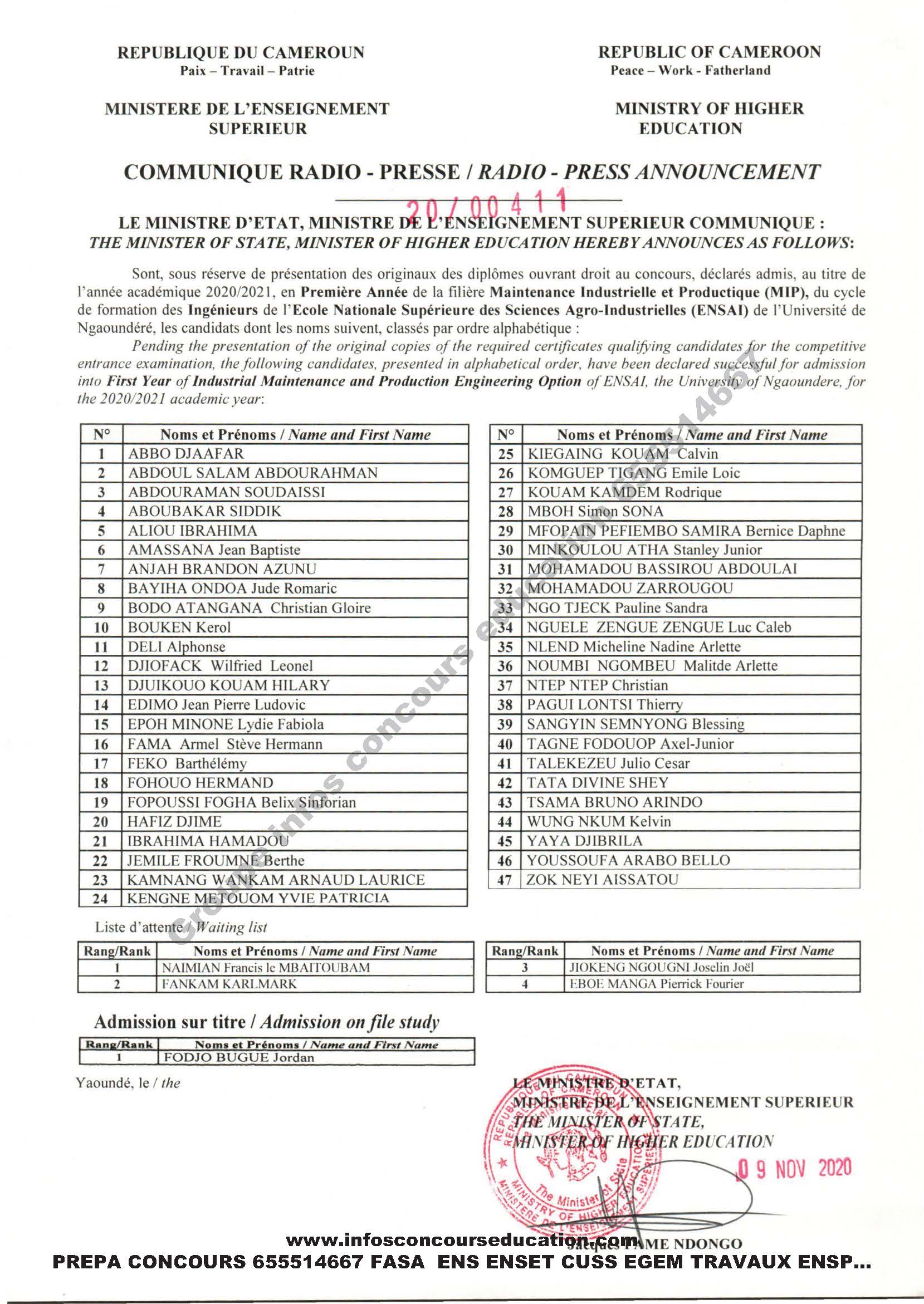 l’année académique 2020/2021, en Première Année de la filière Maintenance Industrielle et Productique (MIP), du cycle de formation des Ingénieurs de l’Ecole Nationale Supérieure des Sciences Agro-Industrielles (ENSAI) de l’Université de Ngaoundéré, les candidats dont les noms suivent, classés par ordre alphabétique: