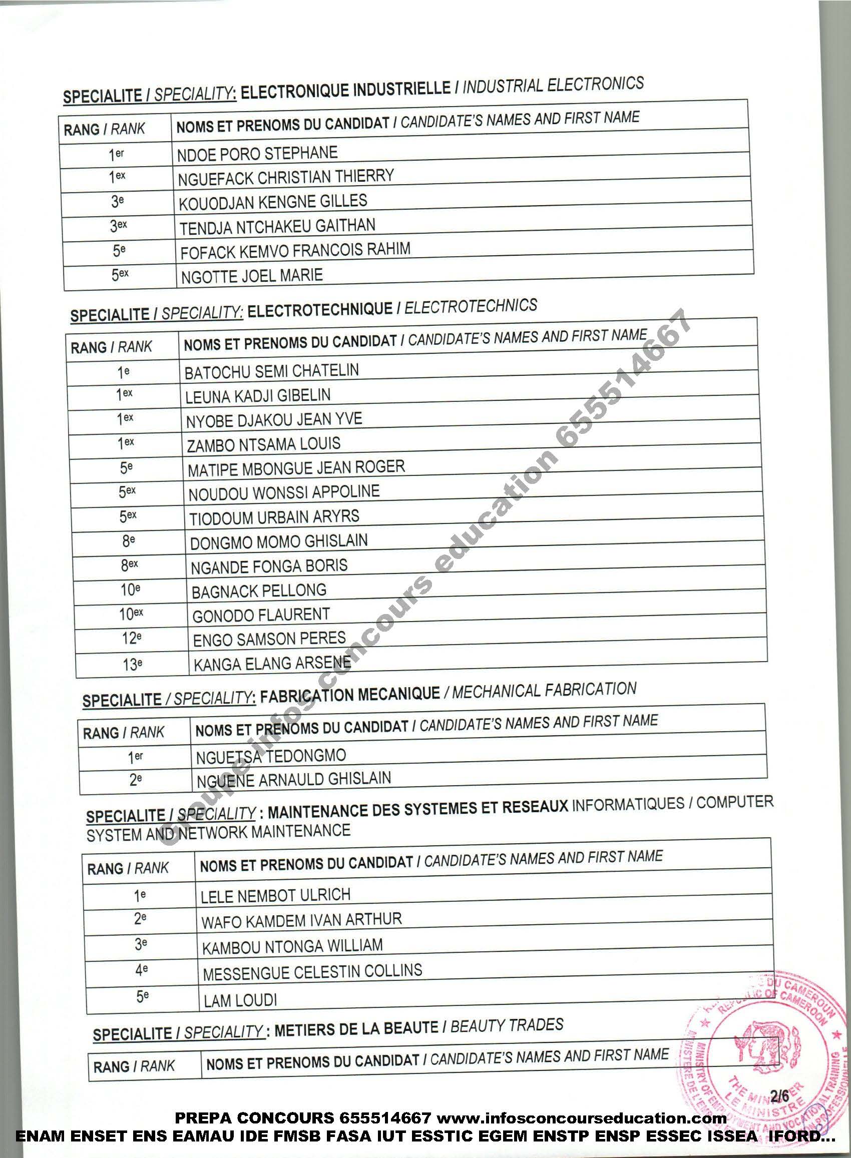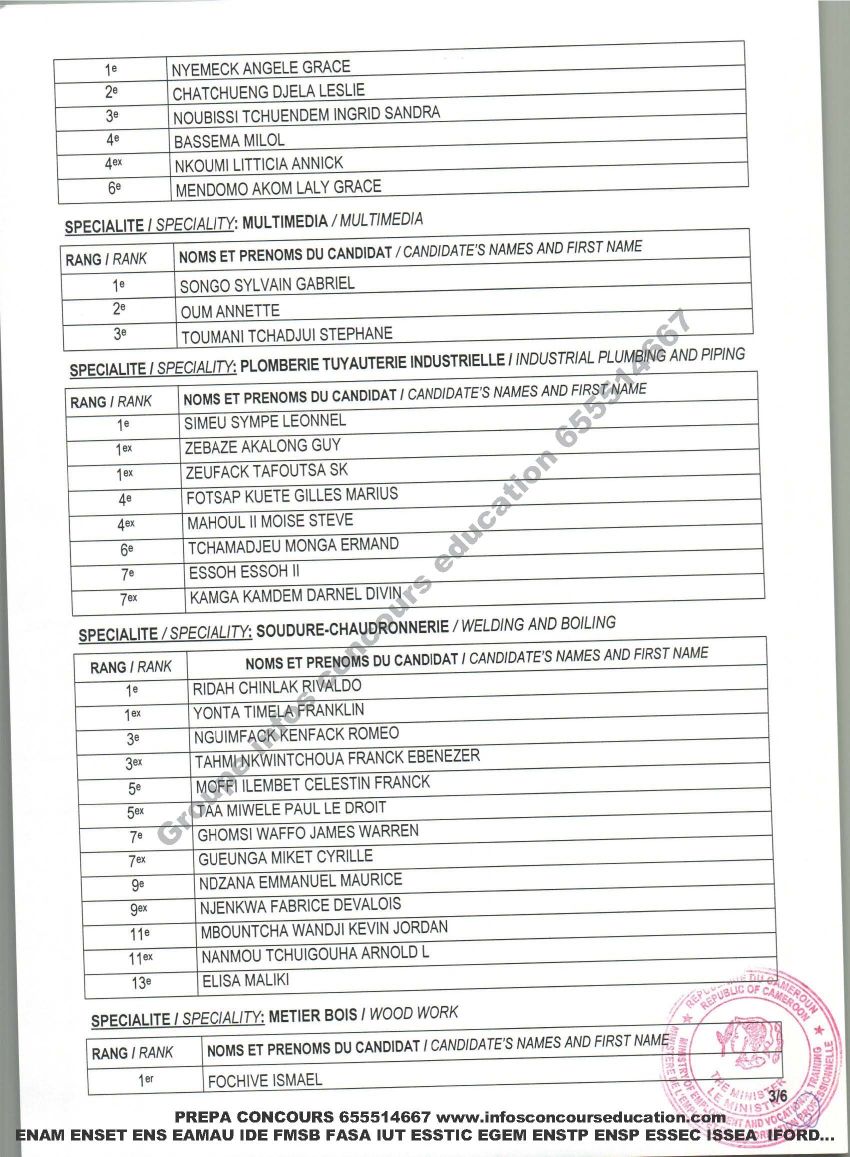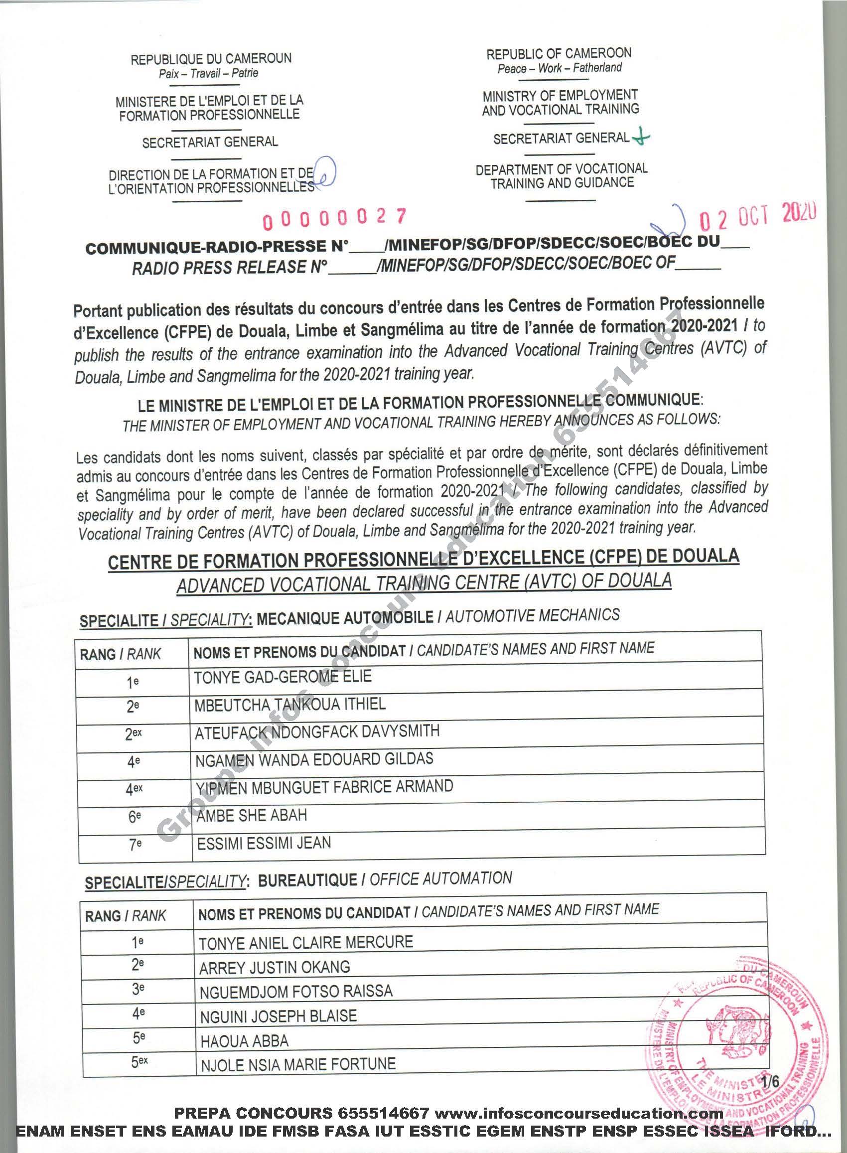 Portant publication des résultats du concours d’entrée dans les Centres de Formation Professionnelle d’Excellence (CFPE) de Douala, Limbe et Sangmélima au titre de l’année de formation 2020-2021 to publish the results of the entrance examination into the Advanced Vocational Training Centres (AVTC) of Douala, Umbe and Sangmelima for the 2020-2021 training year.
